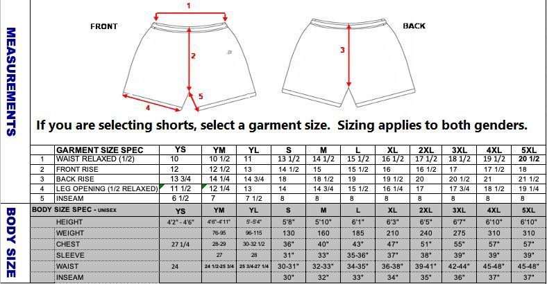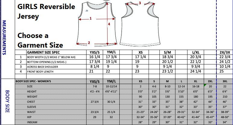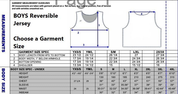 The size guidelines for uniforms is presented in the pictures below. The sizes that you choose from are listed in white row labeled as "GARMENT SIZE SPEC". BODY SIZE SPEC, in the grey section, lists the dimensions of the player that aligns with garment size in the same column above.